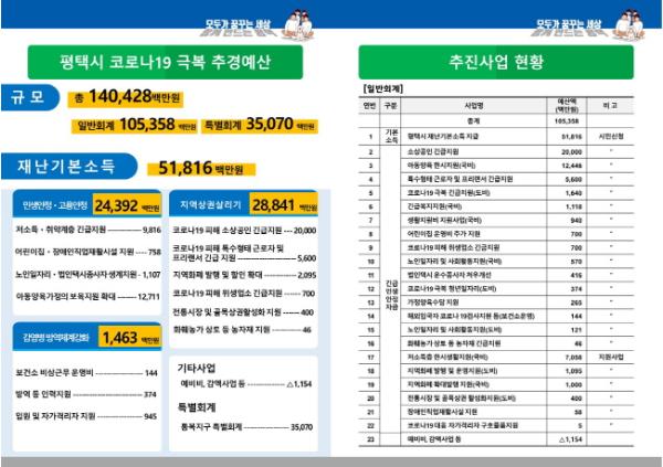 평택시(시장 정장선)는 코로나19로 인한 지역 경제 위기극복을 위해 재난기본소득 518억원을 포함, 1,404억원의추경예산(안)을 편성해 시의회에 제출했다고 밝혔다.