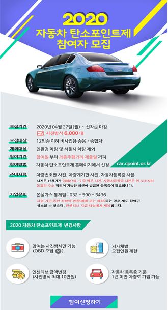 환경부 산하 한국환경공단(이사장 장준영)은 4월 27일부터 '2020년 자동차 탄소포인트제' 참여자를 자동차 탄소포인트 누리집(car.cpoint.or.kr)을 통해 선착순으로 모집한다.