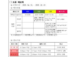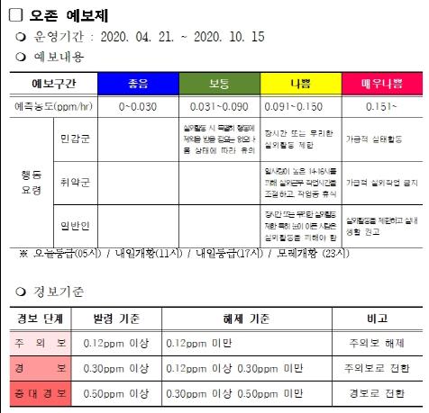 또, 오존경보 발령 시 대기배출사업장 가동률을 조정할 것을 안내하고, 자동차 배출가스 단속 및 점검을 실시한다. 오존예보 등급이 ‘나쁨’일 경우 살수 차량을 활용한 도로 물청소를 강화한다.