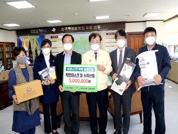 한국전력공사 경북본부(본부장 박정석)는 24일 오전 11시 코로나19 극복을 위해 제작한 면 마스크 2,100매(310만 원 상당)와 안동시 친환경 농산물 등 농·특산물(200만 원 상당)을 안동시에 기탁했다.