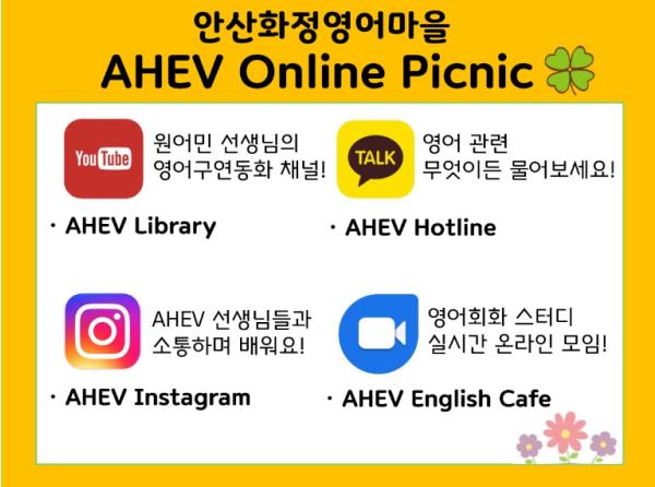 온라인 학습지원 서비스는 안산화정영어마을이 시민을 대상으로 영어 학습 공백해소를 돕기 위해 만든 학습프로그램으로 ‘안산화정영어마을 온라인 소풍 (AHEV Online Picnic)’을 이용해 가정에서 쉽게 활용할 수 있다.