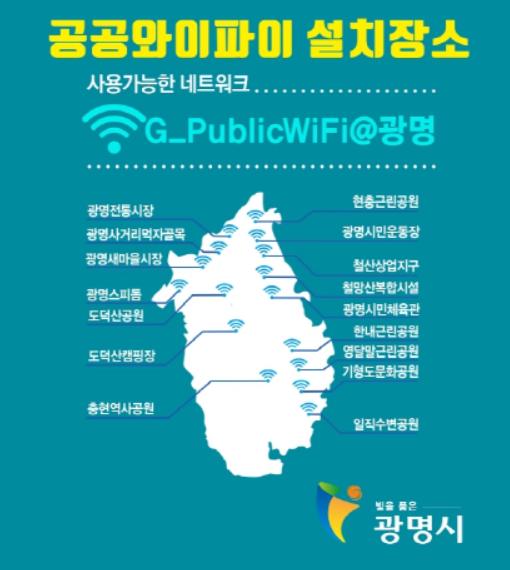 광명시민은 누구나 통신사에 관계없이 스마트폰으로 광명시 공공와이파이 ID인 ‘G_PublicWiFi_광명’을 선택하여 접속하면 빠른 속도(100Mbps 이상)의 무선인터넷 서비스를 무료로 이용할 수 있다.