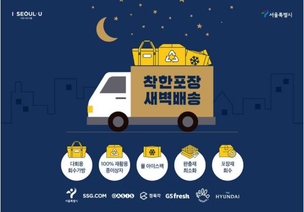 서울시는 새벽배송업체인 ㈜에스에스지닷컴(SSG.COM), 주식회사 오아시스, ㈜정육각, 주식회사 GS리테일, ㈜헬로네이처, 주식회사 현대백화점(가나다순)등 6개 사(社)와 4월 28일(화) ‘친환경 포장, 착한 배송 문화 확산’을 위한 업무협약을 체결한다고 밝혔다.