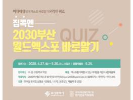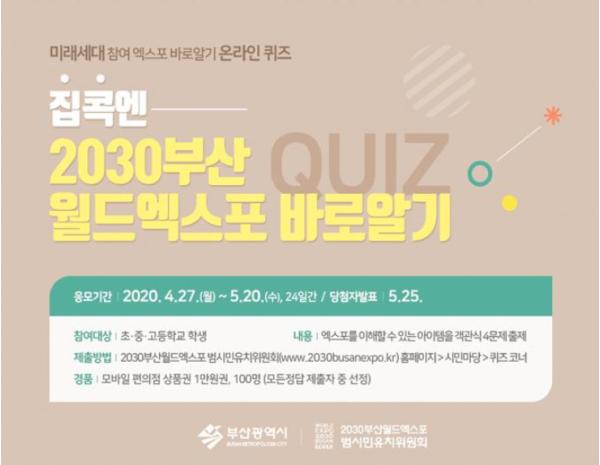 부산시는 2030년 미래의 주역인 청소년이 엑스포를 이해하고 관심을 가질 수 있도록 2030부산월드엑스포 범시민유치위원회(이하 ‘위원회’)와 공동으로 「집콕엔 2030부산월드엑스포 바로알기 퀴즈」 온라인 이벤트를 개최한다고 밝혔다.