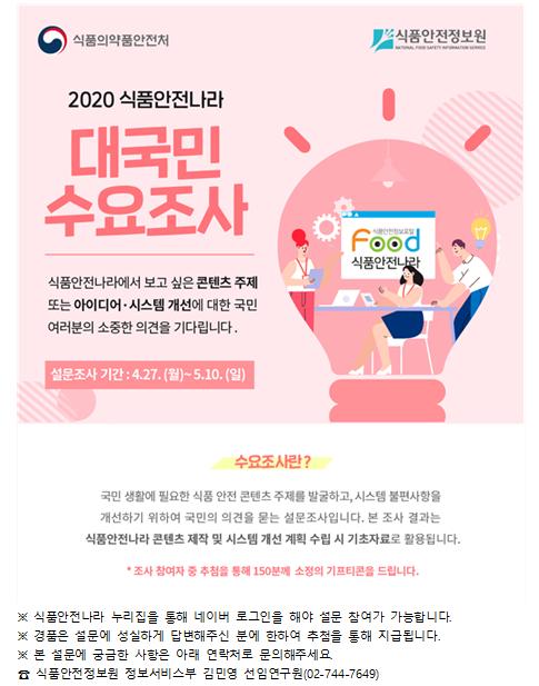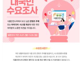 이번 조사는 식품안전나라의 시스템을 개선하고 수요자 요구에 맞는 콘텐츠를 제공하기 위해 마련되었으며, 네이버 아이디로 로그인 후 설문조사 참여하기를 누르시면 응모할 수 있다. 참신한 아이디어 제안자에게는 소정의 선물도 증정할 계획이다.