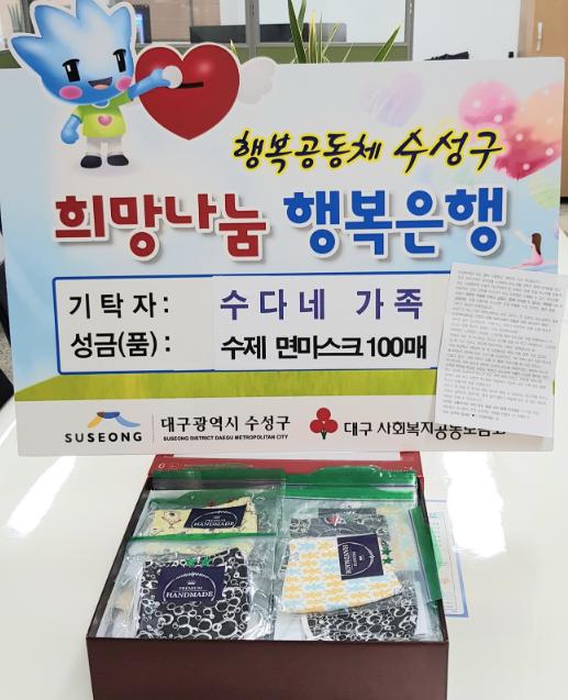 김대권 수성구청장은 “정성들여 만든 소중한 마스크를 기부해 주신 수다네 가족에게 다시 한번 고맙다는 말씀을 드린다”고 말했다.