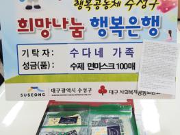 한편, 수다네 가족은 수성소방서와 공동모금회, 시니어클럽 등에도 직접 만든 면마스크 300매를 지원한 바 있다.
