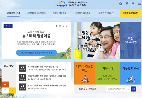 교육포털 메인화면에는 △구청장 교육행정 △도봉구 교육정책의 ‘비전 및 주요사업’ △교육컨텐츠 ‘통합 홍보존’ 및 ‘통합 공지사항’ △나의 수강신청 확인 △교육발전에 대한 자유로운 토론이 가능한 ‘커뮤니티/게시판’이 있다.