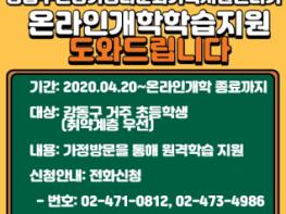 이에 강동구에서 취약계층 아동의 ‘학습권 보장’으로 차별없는 교육환경을 조성하기 위해 「방문학습 지원사업」을 추진하고 있다. 방문학습 지원 신청 가정에 방문해 단말기 세팅, 교육플랫폼 회원가입·로그인·학습하기 등 원격학습을 도와주는 사업으로 온라인개학 종료 시까지 진행된다. 지역 내 저소득 및 맞벌이 가정의 초등학생이라면 누구나 이용할 수 있으며 신청은 강동구건강가정·다문화가족지원센터로 하면 된다.