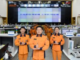 이형철 경기도소방재난본부장과 권용성 재난종합지휘센터장, 본부 직원들은 28일 본부 본관 5층 119종합상황실에서 ‘덕분에 챌린지’에 함께했다.