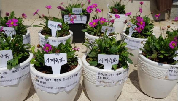 이에 따라 28일에는 조치원 도시지역 등록단체인 꽃과 친환경 도시텃밭(공동체명)이 사계절 국화 화분을 만들어 노인 복지시설에 코로나19 극복을 기원하는 무료 나눔을 추진했다.