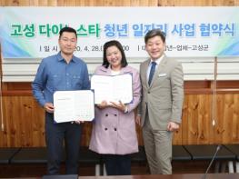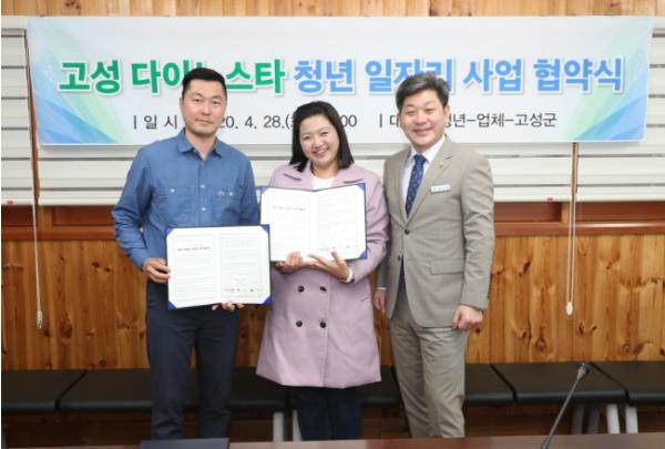 고성군은 4월 28일 고성 다이노스타 청년일자리사업 참여 청년, 업체관계자와 3자 협약식을 개최하였다.