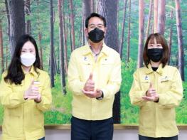 이희진 영덕군수의 지목을 받은 전찬걸 군수는 직원들과 수화동작 취하며 의료진들에게 감사와 존경의 마음을 전달했다 .