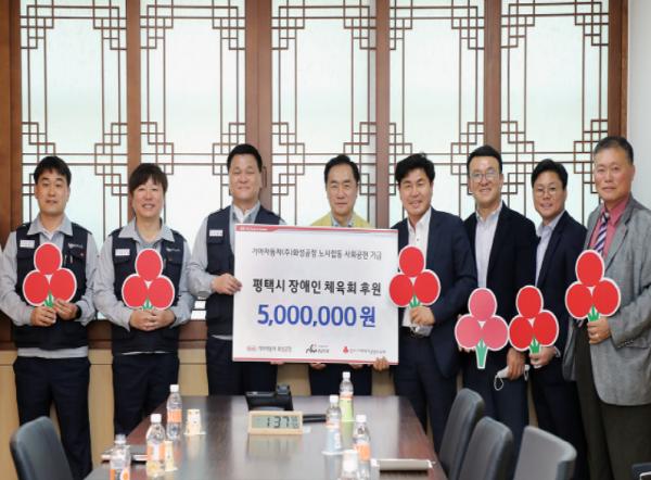 기아자동차 화성공장 노동조합(지회장 신종배)가 지난 27일 평택시청 대외협력실에서 따뜻한 기업사회공헌 활동으로 성금 500만원을 평택시 장애인체육회에 전달했다.