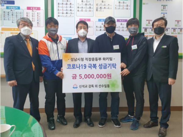 성남시청 직장운동부 하키팀(감독 신석교)은‘코로나19’ 극복 및 어려움을 겪고 있는 시민들을 위해 조금씩 정성을 모아 성금 500만원을 지난 4월 28일(화) 성남시에 기탁하였다.