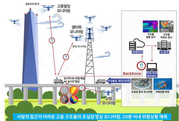(5G) 음영지역 극복을 위한 스몰셀 기술 적용, 항공안전기술원(5G 드론 비행시험장) 및 통신사 네트워크를 연계한 드론 운용 실증, 5G 드론운용을 위한 임무 관제 플랫폼 구축도 병행하게 된다.