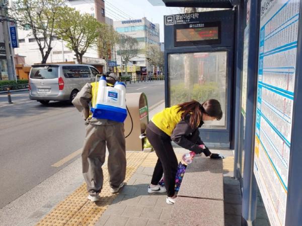 “코로나19” 전파를 차단하고 감염 위기와 불안을 안정시키기 위해 남구자원봉사센터에서는 지난 14일부터 자원봉사자들이 2인 1조로 직접 참여하여 마스크, 장갑 등 안전장비를 착용 후 남구에 소재한 시내버스 정류소에 집중적으로 방역을 실시하였다.