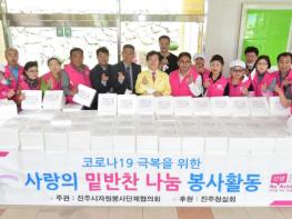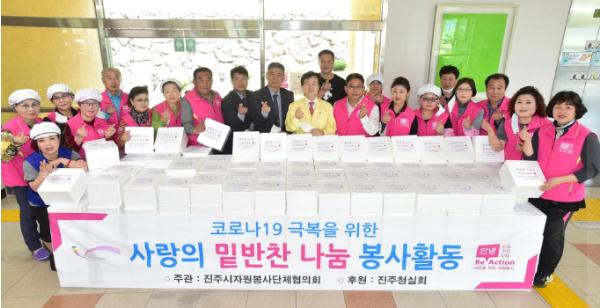 진주시자원봉사단체협의회(회장 방만혁)에서는 재래시장을 통해 우리지역 농산물을 구입하여 밑반찬을 만들고 취약계층에 전달하는 「사랑의 밑반찬 나눔」자원봉사활동을 활발히 전개하고 있다.