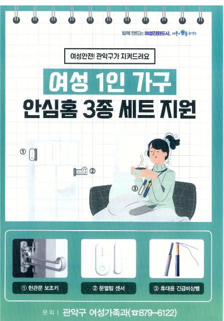 관악구(구청장 박준희)가 여성 1인가구의 안전한 주거생활을 지원하기 위해 여성 '1인가구 안심홈 3종 세트 지원사업’을 실시한다.