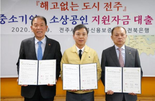 김승수 전주시장과 김용무 전북신용보증재단 이사장, 임용택 전북은행장은 29일 지역 중소기업과 소상공인들의 안정적인 고용을 유지할 수 있도록 ‘고용유지 특별지원금 조성’과 ‘대출자금 지원’을 위한 협약을 체결했다. 이는 코로나19발 고용충격 속에서도 근로자가 대량해고 등 노동시장에서 밀려나지 않는 사회적 분위기를 조성하고 시민들의 안정된 삶을 지켜내는 해고 없는 도시를 만들어가기 위한 대표적인 사업이다.