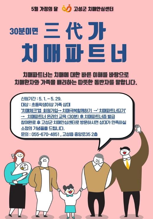 고성군(군수 백두현)은 5월 가정의 달 치매인식개선 사업의 일환으로 ‘30분으로 삼대(三代)가 치매파트너’ 캠페인을 진행한다고 밝혔다.
