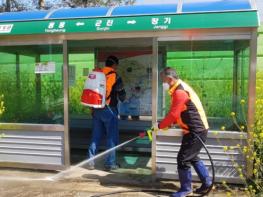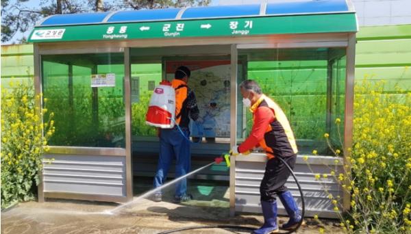 이번 활동은 동해면 전담의용소방대 대원 30여 명의 봉사활동으로 진행되었으며, 지역 내 모든 버스승강장 20곳을 중심으로 방역소독을 실시했다.