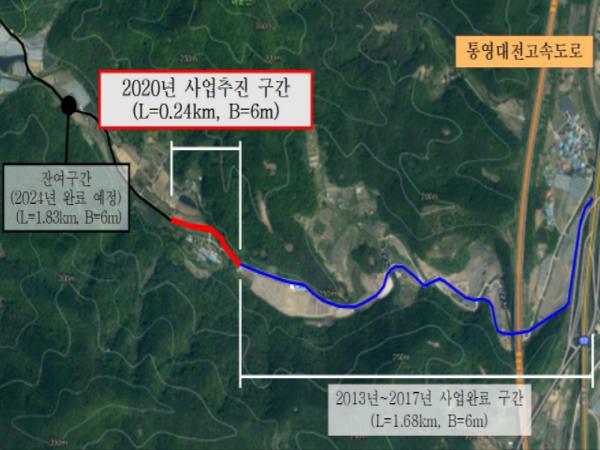 올해는 총 10억 원의 사업비를 들여 연장 240m의 도로를 폭 6m로 확장할 예정이며 2024년까지 전 구간 개통을 목표로 추진 중에 있다.