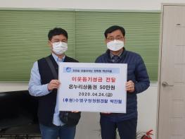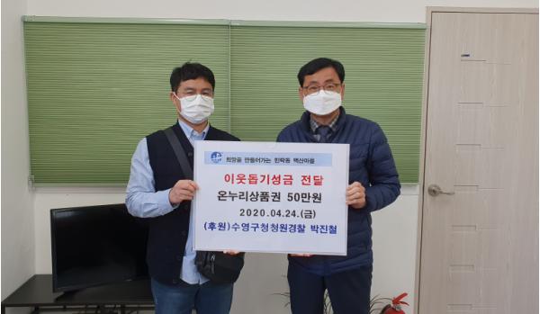 수영구 민락동 행정복지센터(동장 손영복)는 관내에 거주하고 있는 수영구청 청원경찰 박진철(40) 씨가 코로나19로 어려움을 겪고 있는 이웃을 위해 써달라며 온누리상품권 50매를 전달해왔다고 밝혔다.