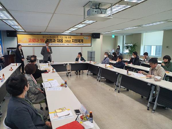 대구광역시사회서비스원(대표이사 김영화)은 29일 오전 사회서비스원 교육장에서 ‘코로나19 경험과 대응 그리고 지원체계’라는 주제로 개원 1주년 기념 포럼을 개최했다.
