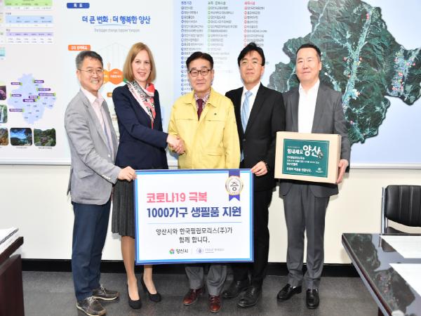 한국필립모리스(주) Irina Ashukina(이리아 아슈키나) 양산공장장, 김주한 대외협력 상무, 대외협력 차장 김진혁, 김정모 부장은 지난달 29일 시장 집무실을 방문해 코로나19 극복 식품 키트 전달식을 가졌다.