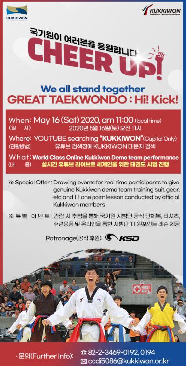 국기원태권도시범단이 신종 코로나바이러스 감염증(코로나19)으로 어려움을 겪고 있는 세계인을 위해 온라인 공연 ‘위대한 태권도: 하이킥(Great Taekwondo: Hi Kick)’을 개최한다.