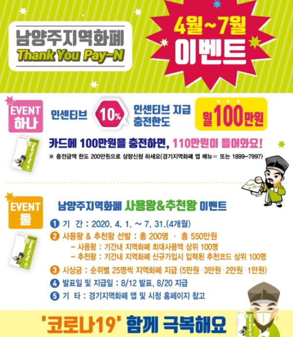 한편, 남양주지역화폐(Thank You Pay-N) 신청은‘경기지역화폐 앱’(카드 우편수령 후 등록·충전) 또는 남양주시 ‘관내 농협·축협 전지점’방문(본인 신분증 및 현금 준비)을 통해 발급이 가능하고, 지역화폐카드에 월100만원을 충전하려면 경기지역화폐 앱(메뉴≡) 또는 상담센터(1899-7997)에서 카드금액 보유한도를 200만원으로 상향(초기설정 50만원) 신청하여야 가능하다.
