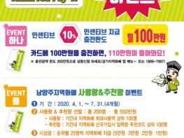 조광한 남양주시장은 “지역화폐 확대발행 및 사용촉진 이벤트를 통해 코로나19로 침체된 골목상권 및 지역경제 활성화를 위해 지역 내 소비를 촉진하고, 소상공인과 영세업자에게 활력을 불어넣는 계기가 되었으면 한다.”며 “앞으로도 더욱 다양한 정책을 발굴하는데 주력하겠다.”고 말했다.