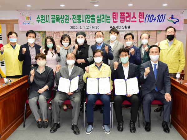수원시와 수원시소상공인연합회, 수원시상인연합회는 1일 시청 상황실에서 ‘수원시 골목상권·전통시장을 살리는 10+10 업무협약’을 체결하고, 코로나19 사태로 위축된 소비를 촉진하기 위해 적극적으로 협력하기로 했다.