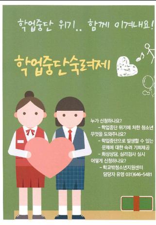 학업중단 위기를 겪고 있는 중?고등학생은 누구나 숙려제를 이용 할 수 있으며, 담임선생님과 상의 후 평택시학교밖청소년지원센터(031-646-5481)로 신청이 가능하다.