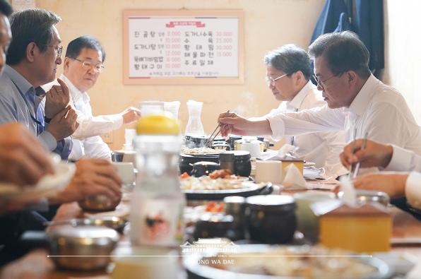 문재인 대통령은 5월1일 점심시간, 수석·보좌관들과 함께 청와대 인근 삼청동의 식당을 찾았다. 점심은 소상공인, 자영업자들이 어려운 상황에서 가급적 주변 식당을 이용해 달라는 독려 차원이다.