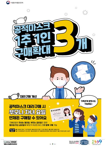 정부는 4월 27일(월)부터 5월 3일(일)까지 시범 시행 중인 공적 마스크 ?1주 1인 3개? 구매 확대 조치를 계속 시행한다.
