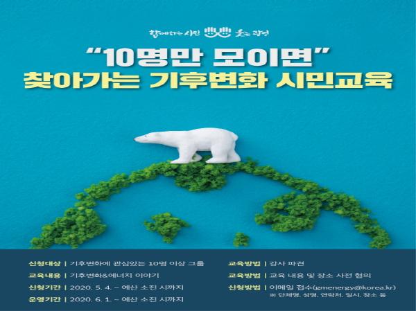 광명시(시장 박승원)는 시민 10명만 모이면 ‘2020년 찾아가는 기후변화 시민교육’을 오는 4일부터 접수 받고 6월부터 12월까지 진행하기로 했다.