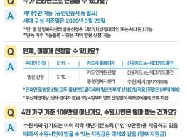 정부 긴급재난지원금은 취약계층에게는 현금, 그 외 시민에게는 현금처럼 쓸 수 있는 신용·체크카드 포인트, 지역화폐 등으로 지급한다. 취약계층은 따로 신청하지 않아도 된다.