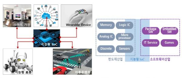 지능형 SoC(System on Chip)란 인공지능 기능의 수행이 가능한 시스템 반도체로서 웨어러블 기기, 스마트 가전, 로봇, 자율주행차 등 4차산업혁명 관련 산업분야 전반에 다양하게 활용되는 핵심부품으로, 반도체 업계에서는 FPGA*, CPU, GPU 등 기반 기술을 지능형 SoC분야로 확장하고 있다.
