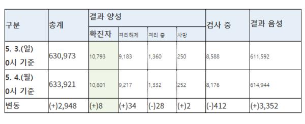 질병관리본부 중앙방역대책본부(본부장 정은경)는 5월 4일 0시 현재, 총 누적 확진자수는 10,801명(해외유입 1,099명*(내국인 90.5%))이며, 이 중 9,217명(85.3%)이 격리해제 되었다고 밝혔다.