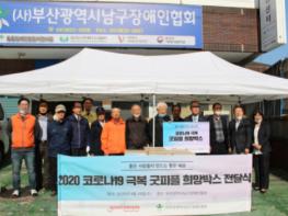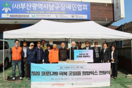 (사)부산광역시남구장애인협회(회장 신중용)에서는 코로나19 감염시 치명적일 수 있는 기저 질환 앓고 있거나, 거동이 불편한 장애인 및 독거노인, 조손가정들을 위해 국제구호개발 비정부기구(NGO) 굿피플(회장 김천수)이 각계각층의 후원으로 마련한 희망박스 150개를 전달 받았다. 이에 남구장애인협회에서 직접 마련한 30개를 포함하여 5월 8일까지 부산 남구 지역 내 독거, 장애, 노인, 조손가정 등 180가정에 전달할 예정이다.