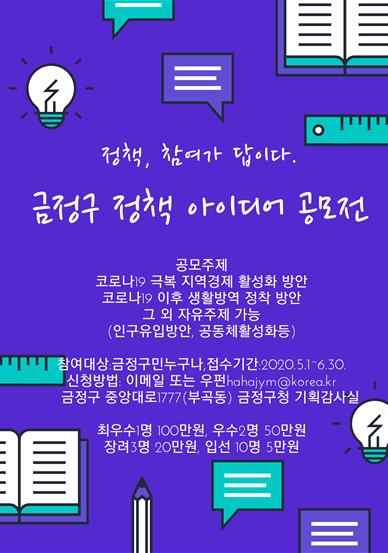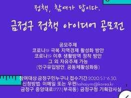 부산 금정구(구청장 정미영)는 주민들의 창의적인 정책 아이디어를 발굴해 구정에 적극 반영하기 위한 ‘정책 아이디어 공모전’을 오는 6월 말까지 개최한다고 4일 밝혔다.