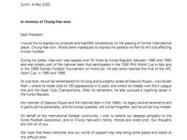 인판티노 FIFA 회장은 끝으로 “80년대 대표팀과 대우로얄즈의 핵심이었던 고인, 그리고 그의 발자취와 성품은 잊혀지지 않을 것”이라며 “전세계 축구계를 대신해 대한축구협회와 고인의 가족, 친구들에게 깊은 애도를 표한다"고 밝혔다.