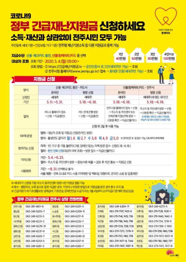정부 긴급재난지원금은 전주형 재난기본소득과 소상공인 공공요금, 특수고용직 지원금 등과 중복해 지급받을 수 있다. 지원금은 8월 31일까지 전라북도 내에서 사용 가능하며 백화점, 대형마트, 온라인 쇼핑, 유흥주점 등에서는 사용이 제한된다.