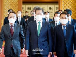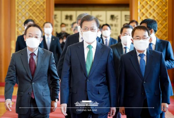 이어 대통령은 "코로나19가 지나면 어려운 경제를 다시 살려야 하는데, 정부와 민간의 역량을 총결집할 필요가 있다"며 "현장의 생생한 얘기를 전해 달라”고 말했다. 그러면서 "가급적 최대한 현장을 만나고, 현장과 정부, 현장과 청와대 간의 가교역할을 해달라"고 덧붙였다.