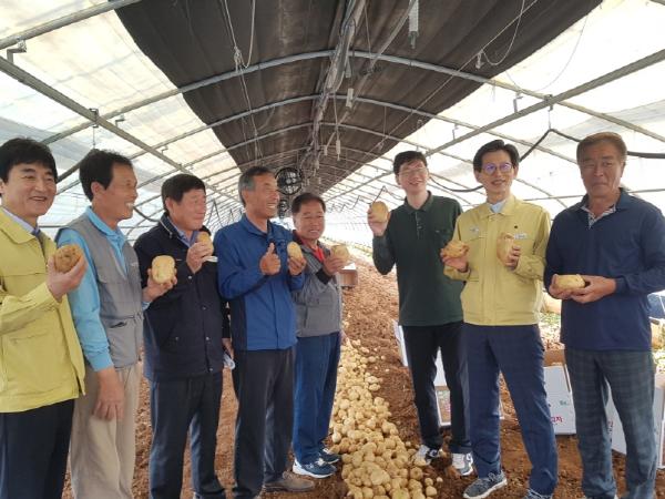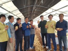 고창군 황토 땅에서 자란 햇감자는 지난달 26일부터 올해 첫 수확에 들어갔다. 6일에유기상 고창군수가 본격적인 햇감자 수확에 들어간 공음면 정재용씨 농가의 수확 현장을 찾아 격려했다.