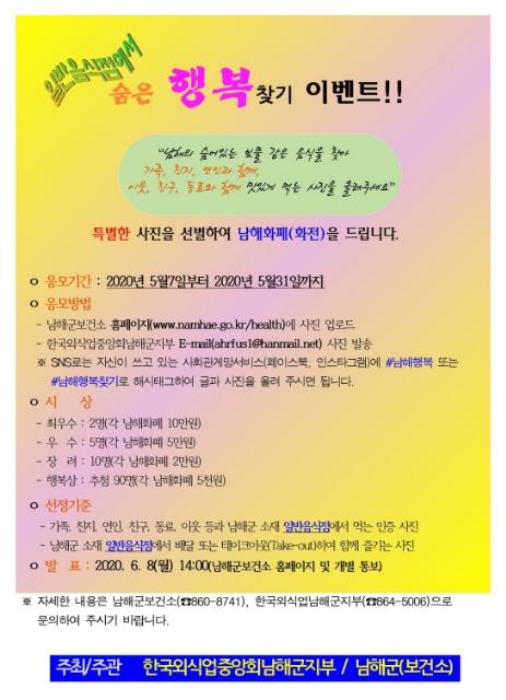 숨은 행복 찾기 이벤트는 코로나19로 침체된 일반음식점 이용을 활성화하기 위한 것으로, 7일부터 31일까지 가족.친지.연인.동료.친구.이웃 등과 함께 남해군 내 일반음식점을 방문해 즐거운 일상을 보내고 있는 사진을 인증하면 상품을 주는 이벤트다.