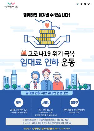 임대료를 낮춘 민간 임대인에게 정부는 인하액 절반에 대한 세액공제 혜택을 제공하고 서울시는 상가 건물보수비, 전기안전점검 등을 지원한다. 구는 이와 별개로, 고통 분담으로 희망과 감동을 주는 임대료 인하 임대인을 위해 마스크 등 방역물품과 태양광 시설 설치비를 추가적으로 지원하기로 했다.