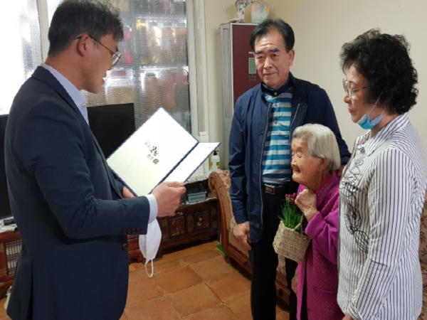 민선식 복지환경국장을 비롯한 전주시 직원들은 이날 김 씨 가정에 방문해 100세 노모에 카네이션을 달아드리며 효행을 실천한 그간의 노고를 격려했다.